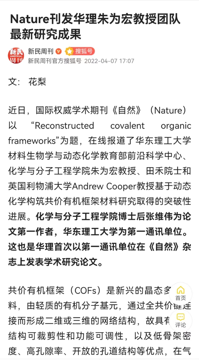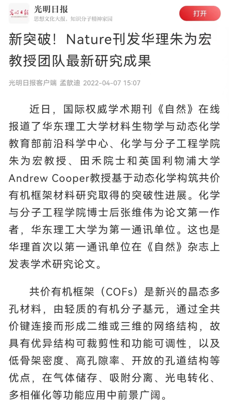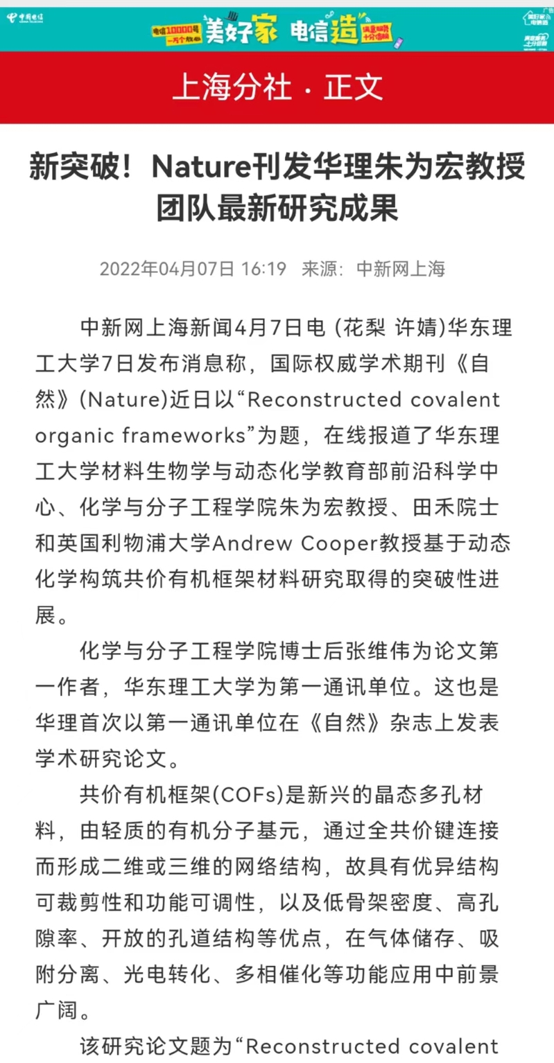 近日,国际权威学术期刊《自然》在线报道了我校材料生物学与动态化学教育部前沿科学中心、化学学院朱为宏教授、田禾院士和英国利物浦大学Andrew Cooper教授基于动态化学构筑共价有机框架材料研究取得的突破性进展。这也是华理首次以第一通讯单位在《自然》杂志上发表学术研究论文。《中国科学报》、人民网、中国教育新闻网、光明日报客户端、上观新闻、中国新闻网、青塔、中化新网、新民周刊、第一教育、上海科技报、周到上海、话匣子等多家主流媒体原发报道近20条。本篇选取了部分报道予以转载。