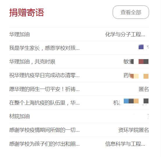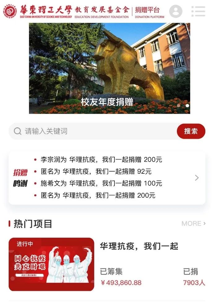 4月上旬,“华理抗疫、我们一起”的线上捐赠活动启动,广大校友及校内师生积极参与并广泛转发,轮番响应。截至4月底,活动累计近8000人次参与,共收到捐赠近50万元。活动的参与者中,有奋战在学校抗击疫情一线的教职工们,有时刻关注着母校发展的广大热心校友们,还有校内莘莘学子。他们自发地汇聚华理“大家庭”的温暖,帮助学校抗击疫情。