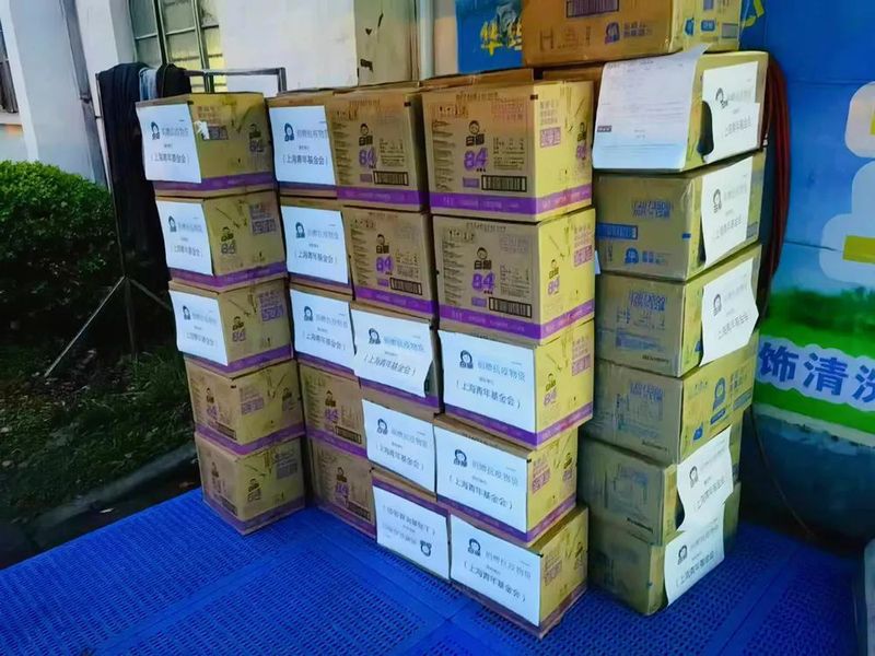 上海青年基金会捐赠消毒湿巾25箱(70片*12桶/箱)、消毒液25箱(12瓶/箱)。