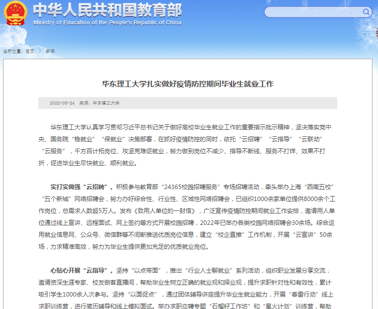教育部网站专题报道学校扎实做好疫情防控期间毕业生就业工作