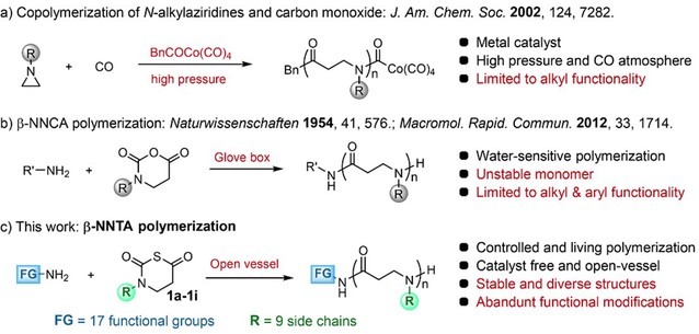 β类肽作为一类β多肽骨架N-H被取代的多肽模拟物,具有耐蛋白酶和优异生物相容性。然而,β类肽的合成存在需要金属催化剂及高温高压或单体不稳定且结构受限等缺点,极大地限制了β类肽的结构多样性、功能和应用。近日,刘润辉教授课题组建立了β-NNTA(N-取代β-氨基酸N-硫代羧基环内酸酐)聚合新方法制备β类肽。β-NNTA单体稳定并且结构丰富多样,可以稳定储存6个月。β-NNTA聚合实现了温和条件下β类肽的可控合成,实现了敞口条件下制备β类肽的突破,拓展了β类肽的结构多样性、功能和应用,在荧光成像、自组装和抗菌等领域展现出良好的应用前景。