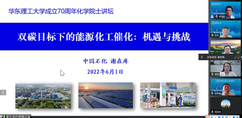 谢在库院士作了主题为“双碳目标下的能源化工催化:机遇与挑战”的报告。他介绍了当前能源和化学品发展的机遇与挑战,对国家相关战略规划进行了解读。他以钛硅分子筛等为典型案例,讲述了催化的变革作用,并围绕热催化、电催化和光催化等分享了催化路径理性设计方面的进展和思考,指出在工业精准催化反应中,分子扩散是催化效率的关键,同时也是工业催化的重点。互动环节,谢在库院士与参会师生探讨了华理与中石化的未来合作研究领域,讨论了如何就氢能利用、碳中和等国家重大需求问题以及青年老师如何结合工业生产开展科研工作等问题。