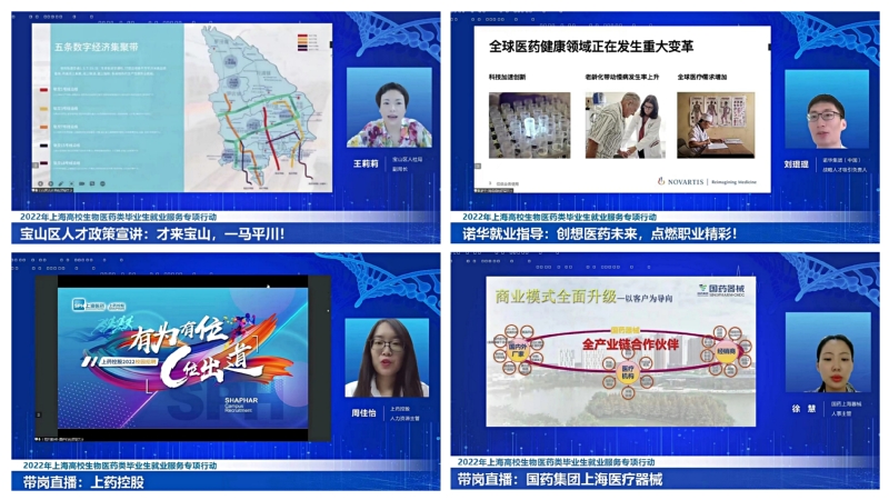 生物医药产业网络招聘会、线上人才政策宣讲、就业指导讲座、名企直播带岗……在随后举行的上海高校生物医药类毕业生就业服务专项行动首场活动上,4729名同学参加网络招聘会,投递简历15213份。直播环节,宝山区人力资源和社会保障局副局长王莉莉宣介了宝山产业发展和各项人才政策。诺华集团(中国)战略人才吸引负责人刘琨琨分享了生物医药行业发展趋势和职业发展。上药控股、国药上海器械、桐树基因、朝晖药业等企业人力资源部门负责人纷纷直播带岗,直播吸引观看人数达3653人,创建简历数235份,投递简历数829份。