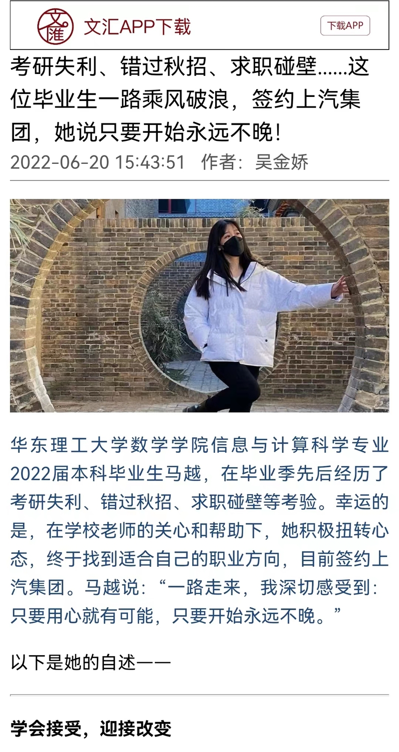 【文汇APP】考研失利、错过秋招、求职碰壁......这位毕业生一路乘风破浪,签约上汽集团,她说只要开始永远不晚!