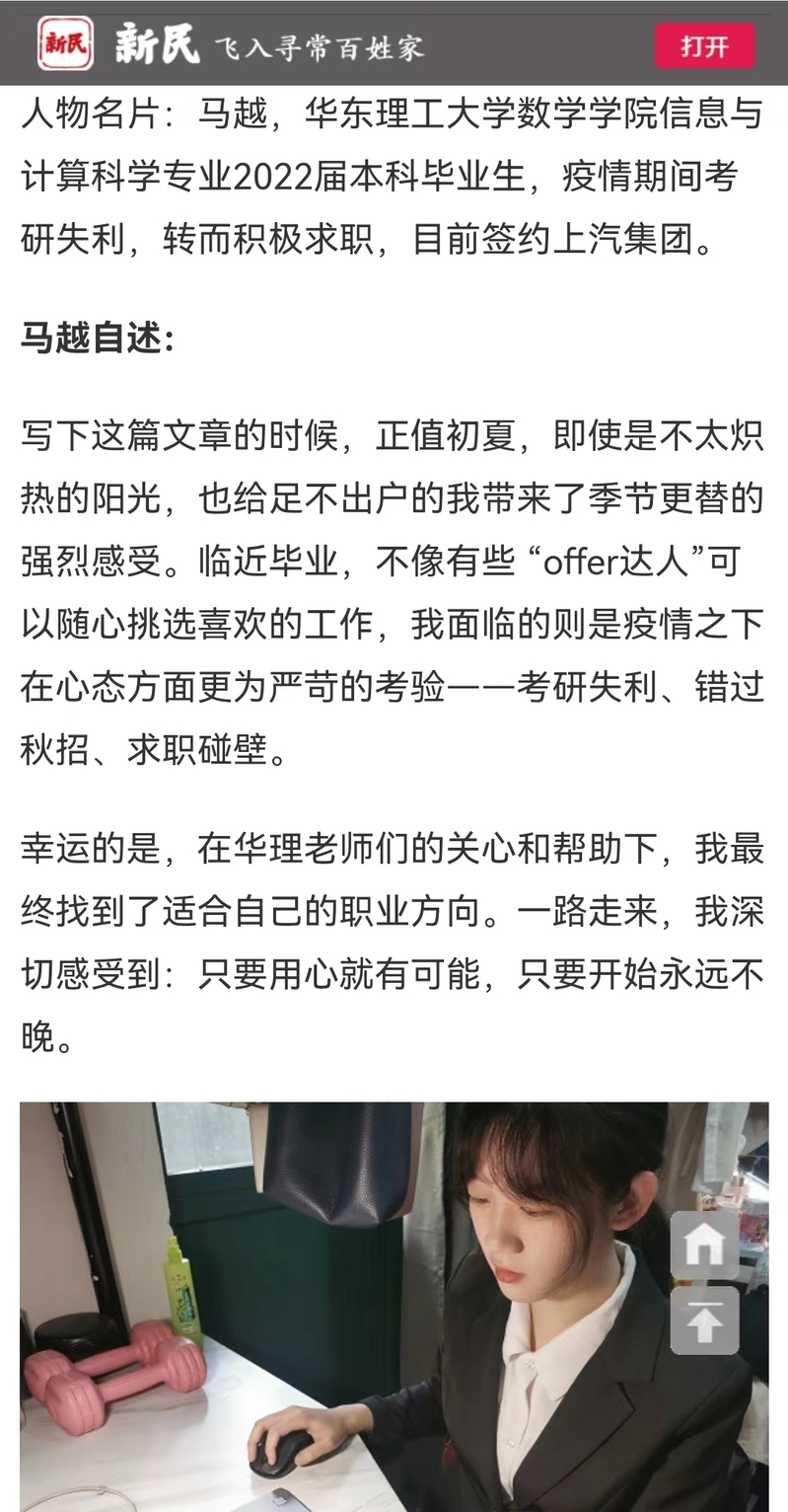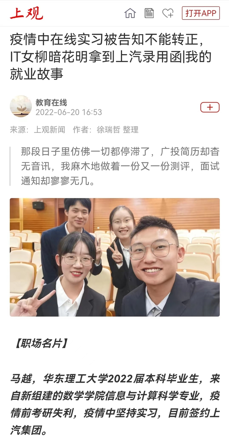 在这个特殊就业季里,我校数学学院2022届本科毕业生马越经历了疫情期间考研失利后,积极转变心态迎接改变,在学校和学院老师的多方帮助下迅速投入到线上求职之中,很快就顺利签约上汽大众汽车有限公司。人民网、《青年报》、上观新闻、文汇APP、新民网、劳动观察、东方网、周到上海、青春上海、上海科技报等近10家媒体进行了原发报道。本篇选取了部分报道予以转载。