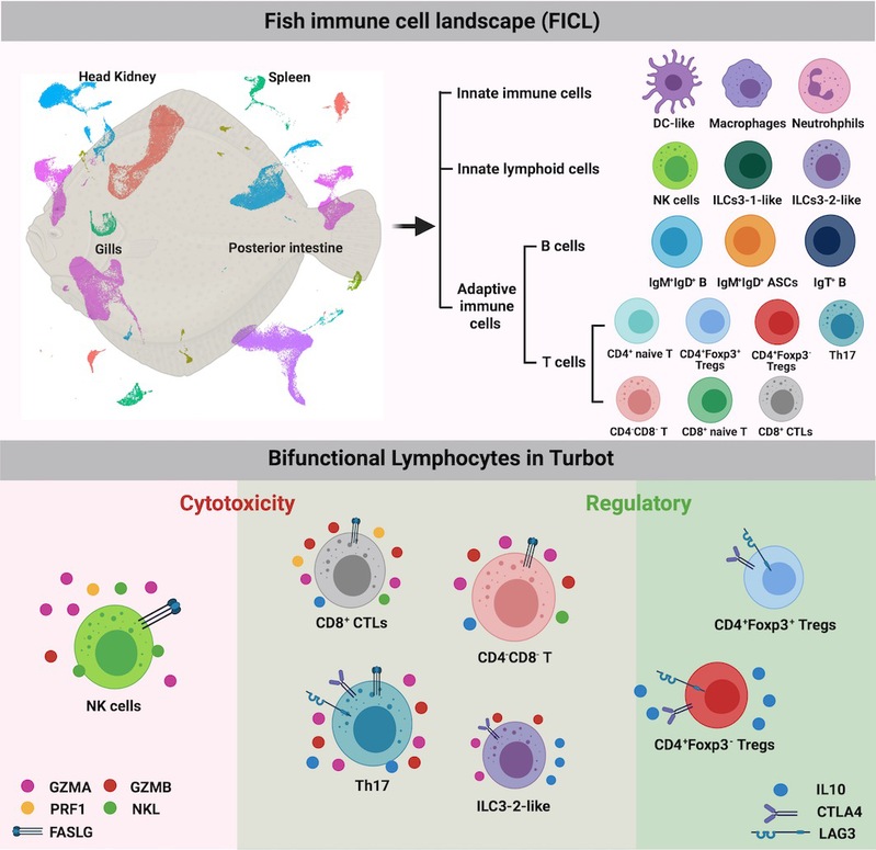 以上述产业需求为导向,课题组以大菱鲆为对象,基于Iso-Seq技术完善了大菱鲆转录组数据库,提升了大菱鲆基因的结构和功能注释质量(Marine Genomics 2022),并在此基础上,通过单细胞转录组测序技术建立了迄今为止种类最丰富的鱼类免疫细胞图谱:成功鉴定了巨噬细胞、中性粒细胞、类树突状细胞、自然杀伤细胞和两种固有淋巴细胞(ILCs3-1-like 和ILCs3-2-like),明确了十类T/B细胞亚群(包括IgM+IgD+B细胞、IgM+IgD+浆细胞、IgT+ B细胞、CD4+ 幼稚T细胞、CD4+ Foxp3+ 和CD4+ Foxp3-调节性T细胞、Th17细胞、CD8+ 幼稚T细胞、CD8+细胞毒T细胞和CD4-CD8- T细胞),并分析了上述鱼类免疫细胞的潜在标志分子,为针对性解析相关免疫细胞的功能提供了公共资源。