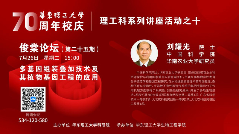 为迎接学校70周年校庆,进一步加强高端平台建设、促进优势领域学术交流, 7月26日,由生物反应器工程国家重点实验室主办的第25期“俊棠论坛”在线上举行。会议特别邀请到华南农业大学刘耀光院士作学术报告。论坛由生物反应器工程国家重点实验室主任张立新教授主持。300余名师生在线领略大师风范。