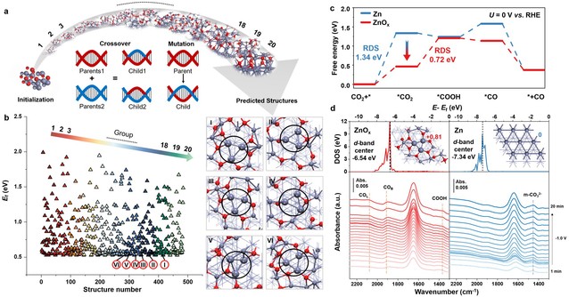 研究团队利用基于遗传算法的全局优化方法,进一步从原子尺度深入探究了Zn2P2O7预催化剂在CO2RR工况环境下的真实活性位点。通过对Zn基催化剂的真实活性结构(具有非化学计量比的ZnOx)进行了预测与模拟,筛选出一类具有稳定局域结构的类金属hollowZnδ+活性位点。密度泛函理论(DFT)进一步证明类金属hollow Znδ+活性位点可以有效地促进CO2的活化以及后续的加氢过程,大幅降低了生成CO的反应能垒;同时表面增强原位红外光谱也从实验层面证实了该活性结构对关键中间体的稳定机制。
