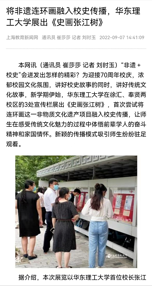 新学期伊始,华理在徐汇、奉贤两校区的3处宣传栏展出《史画张江树》,首次尝试将连环画这一非物质文化遗产项目融入校史传播,让师生在感受传统文化魅力的过程中体悟华理前辈学人的奋斗精神和家国情怀。上观新闻、中国新闻网、东方网、第一教育、上海教育新闻网、上海科技报、新民周刊、上海徐汇、话匣子等近10 家媒体对此进行了报道。本篇选取了部分报道予以转载。