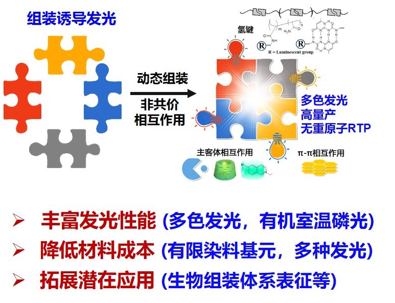 作为国际研究的前沿之一,如何拓展精细化工有机功能染料分子等发光母体更为丰富的发光性能以及功能调控、降低材料合成成本、提高分子材料构建过程的经济性,仍然是面临的重要挑战。围绕这些关键科学问题,马骧将功能染料、超分子化学和光化学有机地结合起来,原创性地提出了“组装诱导发光”的新机制与新策略。他采用非共价作用组装策略和分子工程理念,精细调控能级及能量转移过程,巧妙地实现了对系列功能染料荧光波长和室温磷光效率的有效调控。