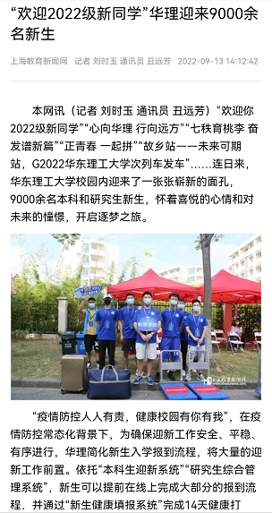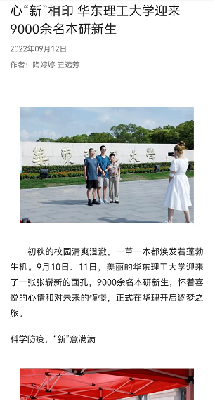 9月10日、11日,华理迎来了9000余名本研新生,恰逢70周年校庆,华理围绕“七秩芳华,与‘理’相遇”这一主题,以喜迎党的二十大为契机,突出迎新工作的校庆特色,倡导绿色低碳,营造温馨浓郁的入学氛围。光明日报客户端、中国新闻网、新民晚报、第一教育、周到上海、东方网、上海科技报、021视频、青春上海、上海教育新闻网、劳动观察等媒体原发报道10余篇,对我校2022年本研迎新相关情况进行了报道。