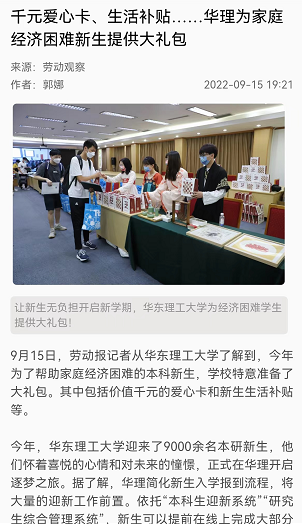 【劳动观察】千元爱心卡、生活补贴……华理为家庭经济困难新生提供大礼包