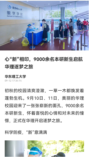 迎新日,华理简化新生入学报到流程,将大量的迎新工作前置。依托“本科生迎新系统”“研究生综合管理系统”,新生可以提前在线上完成大部分的报到流程,并通过“新生健康填报系统”完成14天健康打卡,提交进校申请,上传行程码和健康码、核酸检测阴性报告等。为了让新生提前了解学校,熟悉报到流程,相关老师也提前与新生们在“云端”见面、答疑释惑。