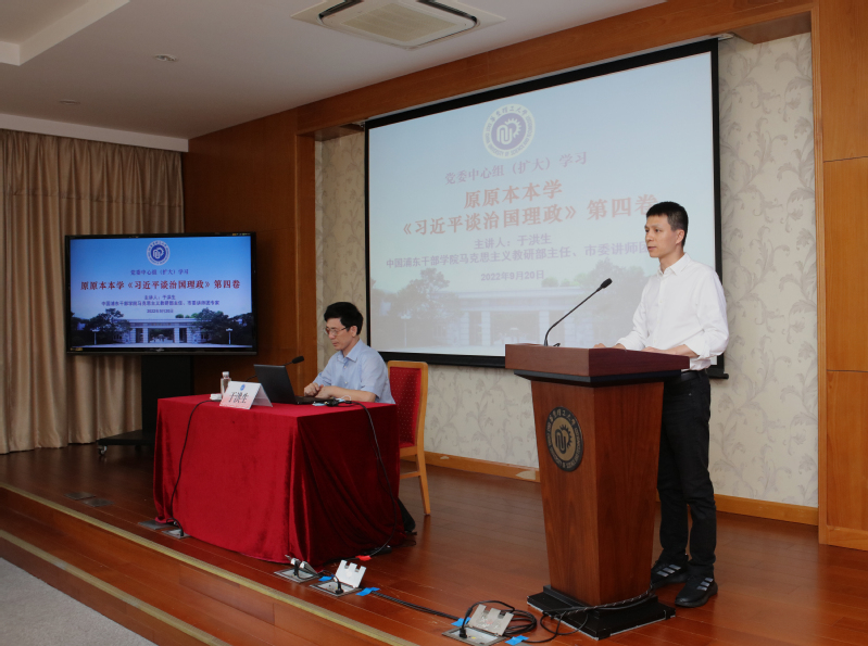 认真学习《习近平谈治国理政》第四卷,是用习近平新时代中国特色社会主义思想武装全党、教育人民的一项重大政治任务。9月20日下午,学校在和平楼第二会议室举行党委中心组(扩大)学习,邀请中国浦东干部学院马克思主义教研部主任于洪生教授来校作“原原本本学《习近平谈治国理政》第四卷”专题辅导报告。校领导、党委中心组成员、全体中层正职领导干‍部等60余人参加学习。校党委副书记项延训主持报告会。