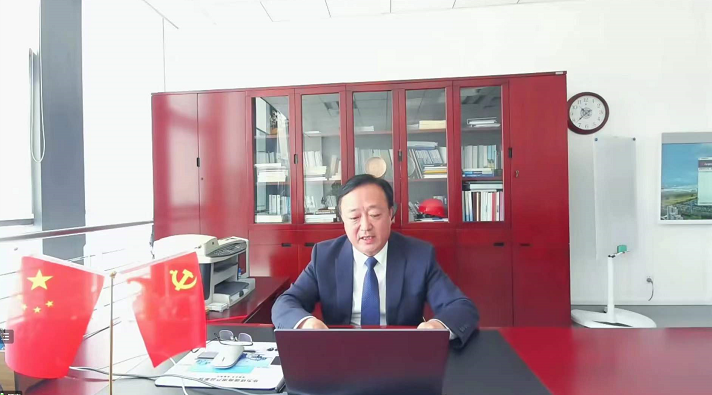 图片说明:联谊会首届会长刘博学以视频连线形式发表讲话