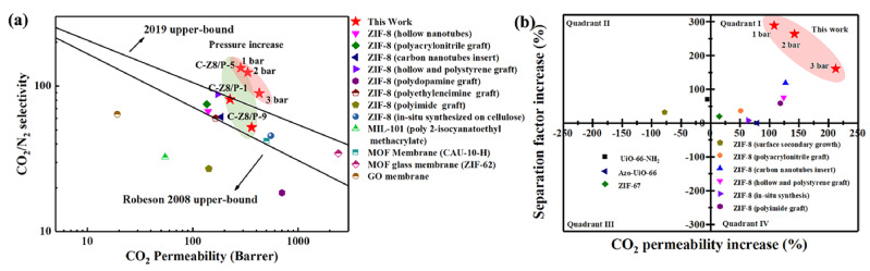 图片说明:配体旋转锚定ZIF-8复合膜的气体分离性能