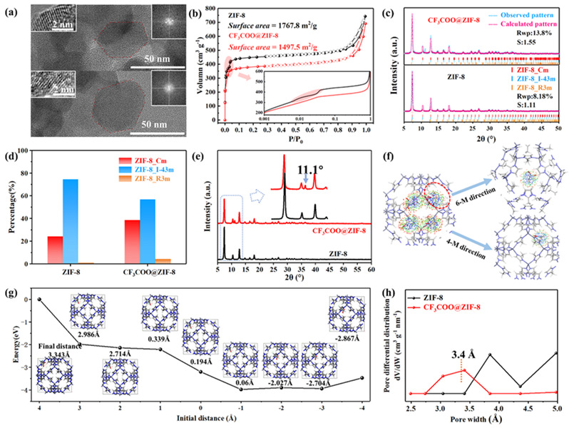 该工作通过三氟乙酸盐与ZIF-8中配体的静电作用实现配体旋转的锚定。N2吸附等温线测试结果表明ZIF-8气体吸附过程中的配体旋转产生的“呼吸效应”被显著抑制。配体锚定导致的均匀配体定向产生了新的11.1°的XRD衍射峰。进一步的DFT理论计算表明三氟乙酸根优先在ZIF-8中的六元窗口与配体作用,并在窗口中心位置达到热力学稳定状态。ZIF-8配体的锚定构建了3.4 Å的孔道尺寸。
