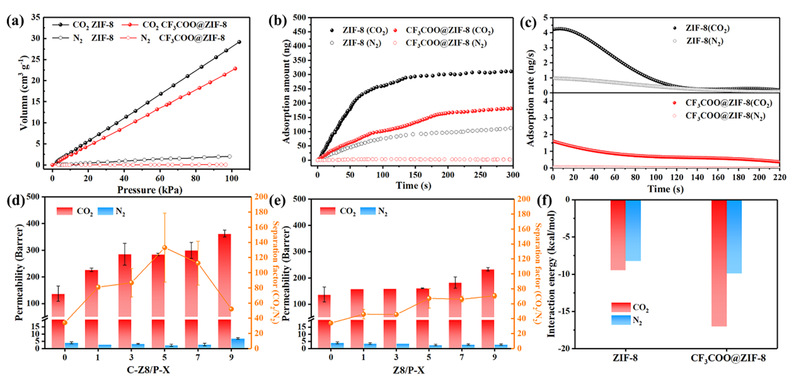 配体旋转的锚定使ZIF-8的CO2/N2吸附选择性从14.02提高至332.86。在吸附测试压力范围内没有观察到明显的N2吸附,进一步用耗散型石英晶体微天平吸附测试验证了锚定后ZIF-8窗口对N2的阻隔作用。相应的膜分离应用表明,相比于ZIF-8复合膜,配体旋转锚定ZIF-8复合膜的选择性提高了2倍。此外,三氟乙酸根增强了锚定后MOF与聚合物基质间的相互作用,提高了MOF孔道的利用率,实现了通量和选择性的同步提高。