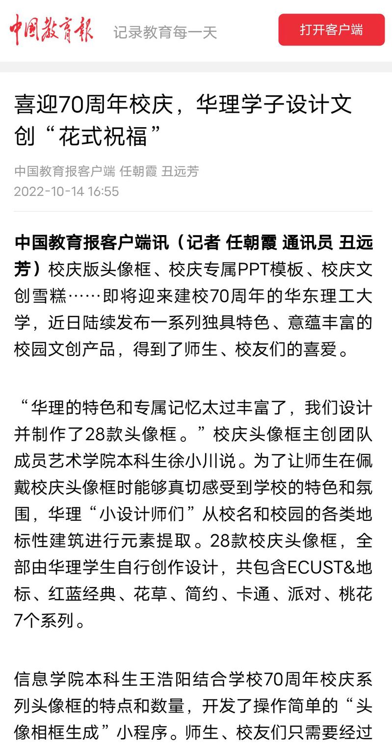 近日,由华理学子设计的校庆版头像框、PPT模版、地标雪糕等一系列文创产品陆续发布,花式表白七秩华理。这些独具特色、意蕴丰富的校园文创产品得到了师生、校友的喜爱,一件件有特色、有内涵、有文化的文创产品,传承了华理的文化基因,传递了华理人的爱校情怀。中国教育报客户端、中国新闻网、新民晚报客户端、东方网、新民周刊、上海科技报、上海教育新闻网、第一教育、上海徐汇、话匣子等媒体原发报道10篇。本篇选取了部分报道予以转载。