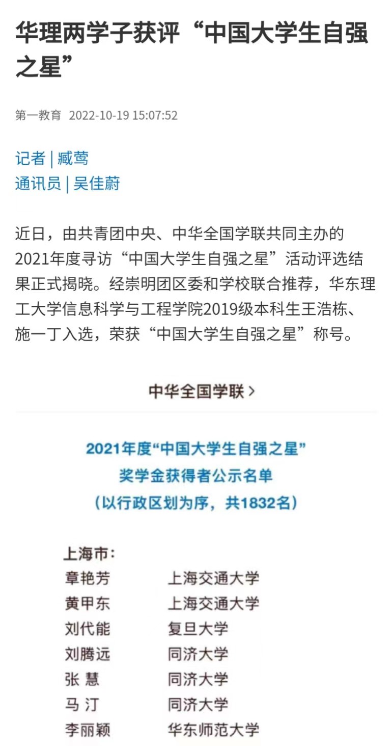 【上海科技报】华理两学子获评“中国大学生自强之星”
