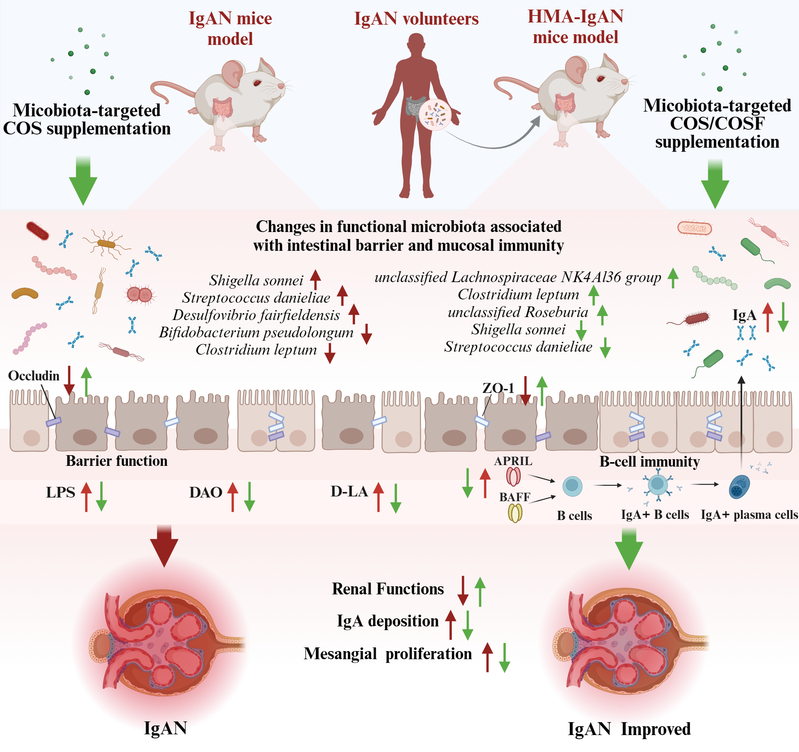 IgA肾病(IgAN)是世界范围内最常见的一种由免疫介导的原发性肾小球肾炎,与肠道菌群的稳态有关。本研究通过构建IgA肾病动物模型以及人类微生物群相关(Human microbiota-associated,HMA)的IgA肾病动物模型,揭示了特定类别功能菌群的变化对IgA肾病的影响,以Shigella sonnei, Streptococcus danieliae, Desulfovibrio fairfieldensis相对丰度的显著增加,和Bifidobacterium pseudolongum, Clostridium leptum相对丰度的显著减少为主要特征,明确了IgA肾病的发生发展与肠道菌群紊乱的相关性;进一步发现壳寡糖通过靶向与肠道屏障和黏膜免疫相关的功能菌群的调节,恢复了模型小鼠肠道菌群的α多样性,减轻了肠道屏障损伤和肠道B细胞过度激活,最终减缓了IgA肾病的肾功能损伤。本研究为微生物群靶向干预来改善IgA肾病提供了重要科学依据。