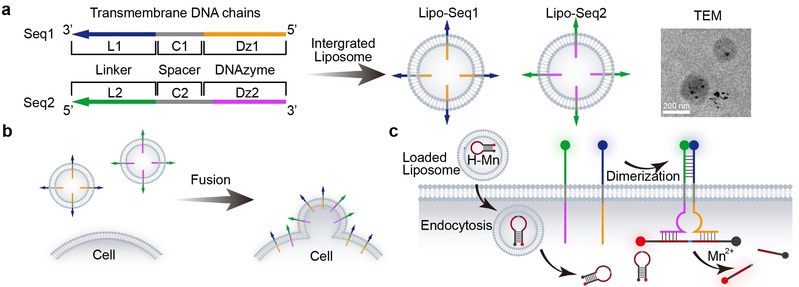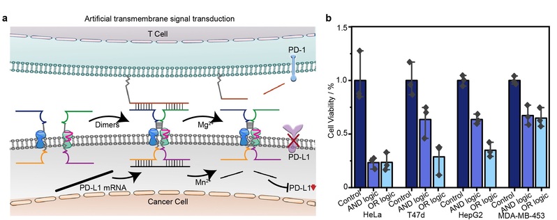 研究人员设计了一种基于DNA纳米结构的跨膜人工受体系统,实现了细胞表面信号传导和精确的细胞功能调控,为细胞工程与生物传感领域提供了新的策略。跨膜DNA受体由三部分组成:1.胞外信号接收域:通过适配体(aptamer)识别特定膜蛋白(如MUC1、Met);2. 疏水跨膜锚定域:利用C12脂质链将受体稳定锚定在细胞膜上;3. 胞内信号输出域:通过DNAzyme(DNA酶)实现下游基因调控或蛋白表达控制。通过AND/OR逻辑门控机制,受体仅在特定膜蛋白组合存在时激活(如同时识别MUC1和Met触发AND逻辑),实现细胞类型特异性响应。受体二聚化后激活金属离子依赖性DNAzyme,可精准切割PD-L1 mRNA,抑制免疫检查点蛋白表达,显著增强T细胞对癌细胞的杀伤效率。