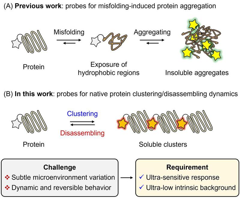 在蛋白质凝聚物研究领域,由蛋白聚集折叠和天然蛋白质成簇是两类基本的生物学过程。特别是天然蛋白质成簇,在细胞命运决定和稳态维持中起到关键作用。然而,与蛋白误折叠引起蛋白质聚集(液液相分离或液固相分离聚集体)不同,蛋白质成簇更有可能成为非典型的相分离态,表现为聚集体微环境变化微小、显著的成簇/解聚可逆性,其独特的动态性和微环境特征对建立时空监测技术提出了重大挑战,而开发相应的示踪探针设计更成为关键核心。迄今,对蛋白质成簇/解聚的可视化动态成像鲜有报道。