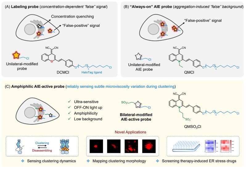 图片说明:从单边修饰到双边修饰的激活型化学遗传学荧光探针设计策略:降低荧光背景信号、减少非特异激活信号、提升响应灵敏度;实现对蛋白成簇/解聚的原位检测、蛋白成簇形貌成像、内质网应激相关药物高效筛选