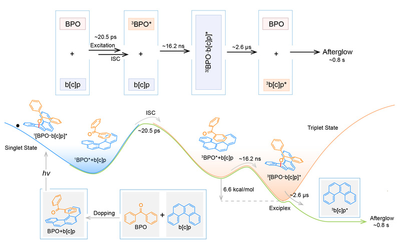 近年来,有机室温磷光材料由于其独特的光物理过程、长发光寿命等特性以及在高端防伪、信息加密、时间分辨的生物成像等领域具有巨大的应用潜力而吸引了研究人员的广泛关注。由于系间窜越过程自旋禁阻的问题,室温磷光材料的构建一直以来都较为困难。近期发展的双组分掺杂策略大大降低了此类材料的构建难度。具体来说,该策略主要是通过将微量的一种化合物掺杂到另一种化合物中以构建三线态陷阱,继而实现长余辉发光。虽然这类材料收到了广泛关注,然而其内在发光机制一直存在争议。