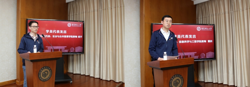 教工党支部书记代表、社会与公共管理学院胡开,留学归国教师代表、信息科学与工程学院曹跃依次发言。他们对学校提供交流学习机会、关心支持青年教师成长表达感谢,并表示将严格遵守培训纪律,认真完成培训任务,将培训所学融入为建设教育强国、科技强国、人才强国贡献力量的具体实践。