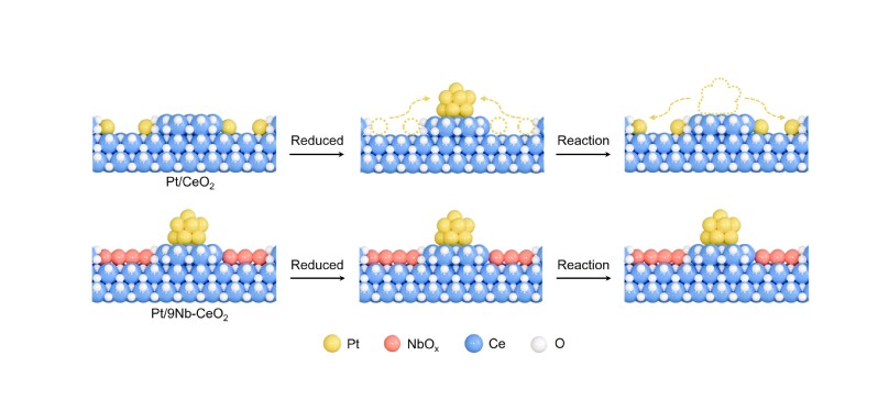 本研究揭示了Pt/CeO2催化剂在丙烷完全氧化反应中的活性衰减机制:Pt纳米团簇在工况条件下转化为催化惰性的单原子“旁观者”是导致失活的根本原因。研究团队提出了一种基于NbOₓ修饰的界面工程的策略,这种策略中,NbOₓ对Pt物种状态的调控并不是直接与Pt相互作用,而是通过占据CeO2表面的强结合位点,暴露相对弱的Pt锚定位点,从而避免反应产物水诱导的Pt单原子化过程。保留的金属态Pt纳米团簇展现出显著增强的丙烷C-H键解离能力,使丙烷完全氧化反应速率提升37倍,同时改善其稳定性。该界面工程策略同时具有普适性,不仅可以拓展到促进CO氧化反应,还可拓展至其他贵金属催化剂在NbOₓ修饰CeO2体系中的设计。本研究不仅阐明了工况条件下抗分散及抑制单原子物种生成的重要性,更创新性地提出了通过界面调控保留金属活性团簇的概念,为负载型贵金属催化剂设计提供了新的理论依据。