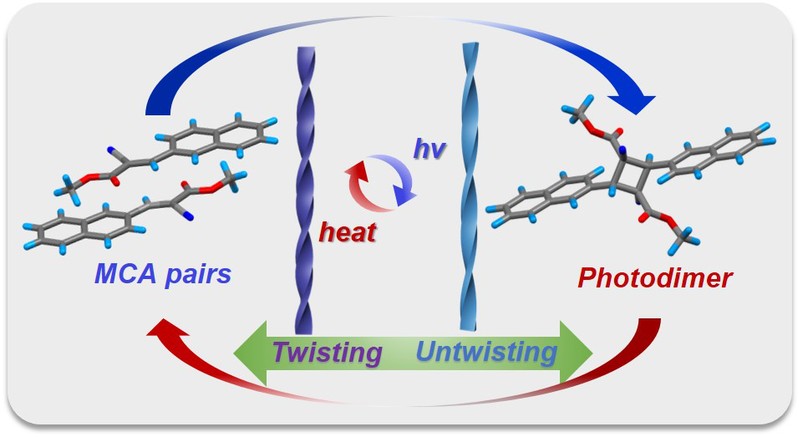 图片说明:MCA有机螺旋结晶纤维在光照和热刺激下发生可逆的固态[2 + 2]光二聚化,产生多次解扭和扭曲可逆循环运动