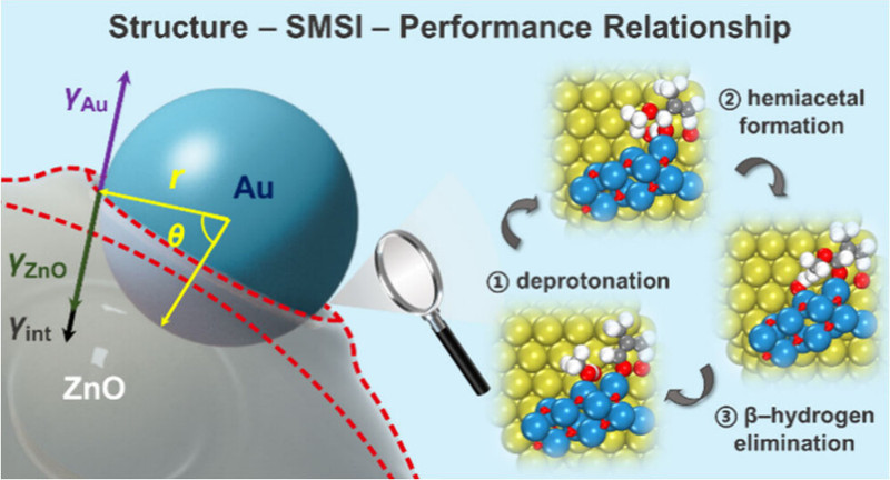 金属-载体之间的“化学默契”长期以来被视为催化科学的核心谜题之一。近日,我校化工学院、化学工程与低碳技术全国重点实验室段学志教授、陈文尧特聘研究员等,首次揭示了金属-载体强相互作用(SMSI)的“钟形”尺寸依赖性规律,并基于此设计出高性能的金-氧化锌(Au/ZnO)催化剂,显著提升了氧化偶联反应的效率与选择性。相关成果以“Taming Strong Metal-Support Interactions to Generalize Gold–Zinc Oxide Catalysts in Oxidative Coupling”为题发表于《美国化学会志》(J. Am. Chem. Soc. 2025, 147, 9, 7829–7839)。