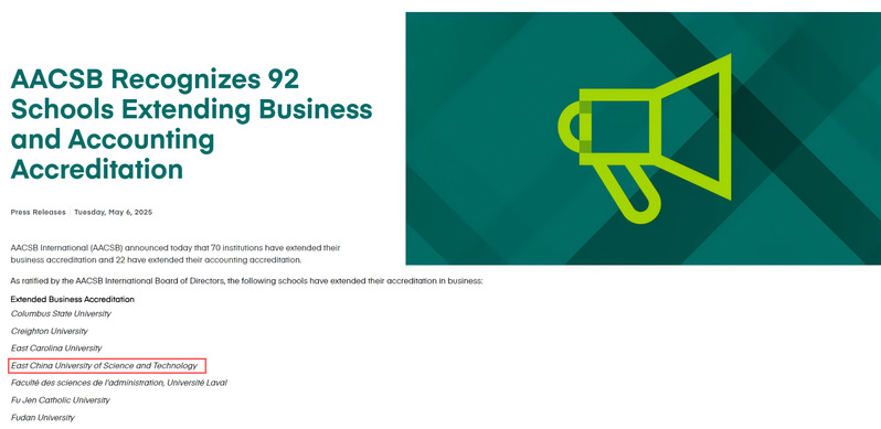 5月7日,国际精英商学院协会(The Association to Advance Collegiate Schools of Business,简称AACSB)正式发函确认,我校商学院在经过AACSB持续改进评审委员会的严格审议以及董事会的批准后,顺利通过AACSB再认证,有效期为六年。