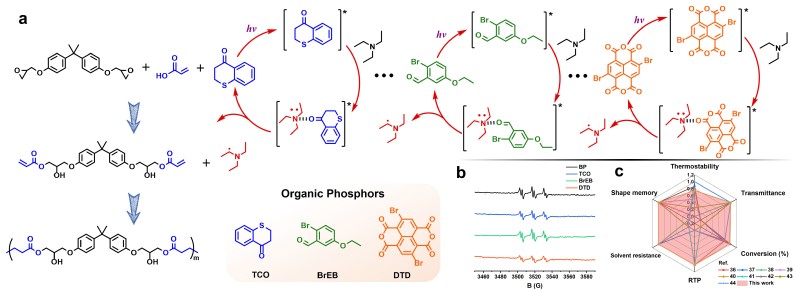 近年来,光固化材料因其快速固化、高精度成型和节能环保等特性,在3D打印、电子封装和医疗等领域得到广泛应用。然而,传统光固化材料在紫外光照射过程中始终呈现无色透明状态,导致难以通过肉眼直接观察其固化进程,给实时监测带来挑战。有机磷光分子对环境刚性变化具有高度敏感性,而光固化体系在固化过程中会发生显著的液-固相转变。将有机磷光分子引入光固化体系,可利用其磷光特性对固化过程进行实时可视化监测,这对优化光固化工艺具有重要意义。