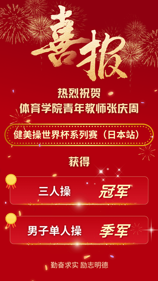 2025年健美操世界杯日本站于北京时间4月27日晚落幕,体育学院青年教师张庆周荣获三人操冠军及男子单人操季军。