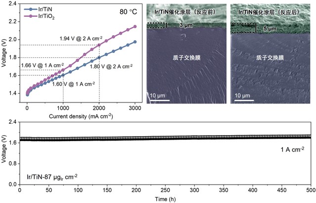 针对这一关键问题,我校材料科学与工程学院清洁能源材料与器件团队以Ir/TiN负载型催化剂为模型材料,追踪了其在长期OER运行过程中的结构演化趋势,发现了一种载体原位溶出诱导的物种捕获效应,实现载体失稳反向强化催化剂稳定性的作用机制。在长期测试过程中,TiN载体逐渐氧化溶出,同时部分Ti物种被催化剂表面捕获,趋于形成表面Ti锚定的无定形IrOx稳定结构,这种载体溶出诱导的捕获效应有效抑制了活性非晶IrOx的进一步溶出。通过该策略构建的负载型催化剂可以在反应过程中将Ir的溶出减少89%,从而使性能衰减速率降低83%。这种材料结构在工况环境下的自适应溶出,也在催化层中引发了一种独特的自增厚效应:催化层自发趋于疏松多孔并维持一定厚度,从而避免了超薄催化涂层结构完整性、机械稳定性以及平面电导率差的问题。基于上述结构特点,在87 μgIr cm-2的超低负载量下,Ir/TiN作为阳极催化电极构建的PEM电解槽仅需1.60 V的槽压即可达到1.0 A cm-2的电流密度,并保持稳定运行500 h没有明显性能衰减。该研究加深了非氧化物材料作为OER催化剂载体的工况构效关系理解,并为可控构建超薄催化电极结构提供了一种全新思路,进而有助于大幅降低PEM电解水技术对贵金属的高度依赖性。