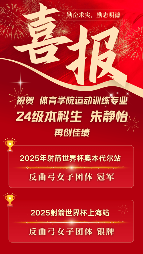 在2025年射箭世界杯年度首站——美国奥本代尔站比赛中,体育学院运动训练专业2024级本科生朱静怡与国家队队友默契配合、表现惊艳,先后力克法国、西班牙等国家代表队,最终在反曲弓女子团体决赛中战胜东道主美国队,斩获中国代表团本届赛事首金。