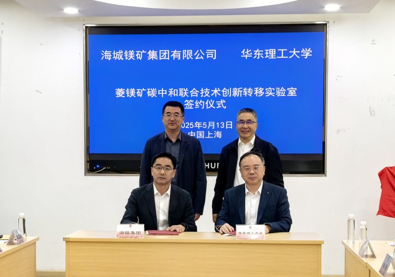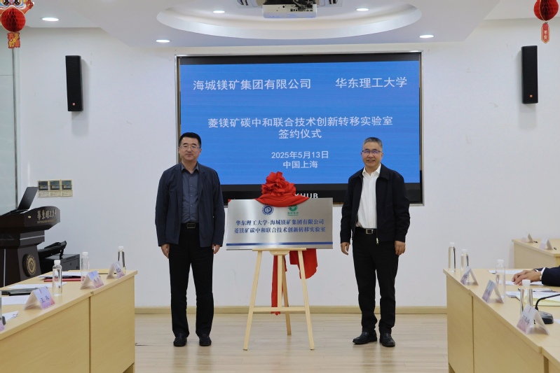 在双方共同见证下,我校化工学院刘殿华教授与海镁集团总经理赵立强代表双方签署联合实验室合作协议。阎海峰与陆荐援共同为实验室揭牌,标志着双方在菱镁矿CO₂捕集制甲醇等关键技术领域的合作正式启动。