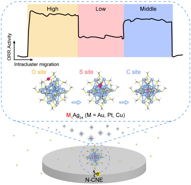 图片说明:高分辨单颗粒碰撞电化学方法实时监测M1Ag24团簇中掺杂单原子由团簇表面(O位点)、亚表面(S位点)向中心(C位点)的动态迁移过程