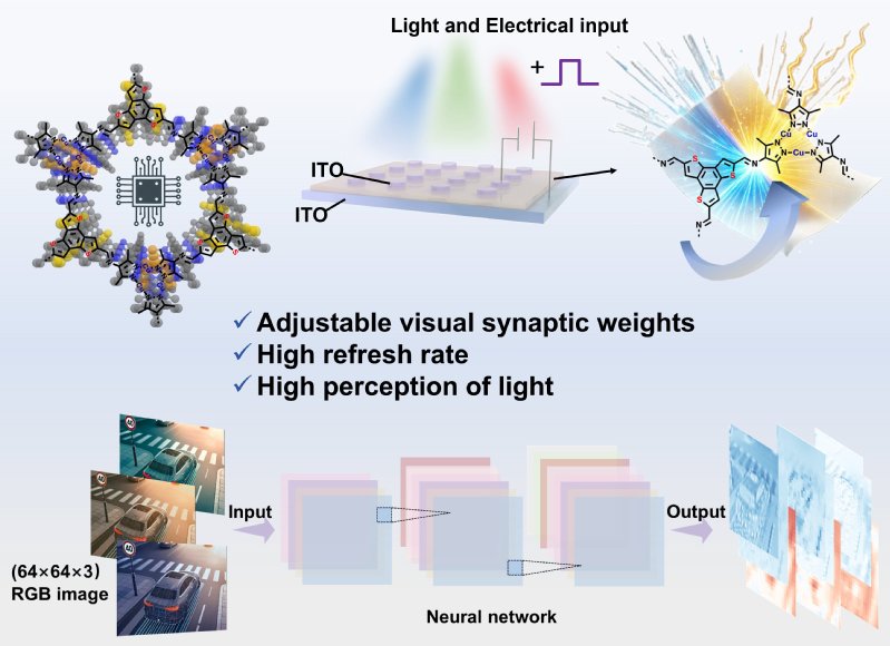 人工视觉神经系统通过整合图像感知、存储与计算功能,已成为突破冯·诺依曼瓶颈的潜力解决方案。基于现有光电忆阻器受限于需要特定波长或长时间输入才能维持稳定性能的缺陷,研究团队开发了一种苯并噻吩修饰的共价有机框架材料。该材料通过中等供电子基团(苯并三噻吩)和氧化还原活性基团(甲基三核铜)的有序限域分布,显著提升了甲基三核铜在低压(0.2V)氧化还原过程中的光电响应性能。快速的弛豫时间,结合电导的协同光电化学调制,即使在高速快门条件下,也能在短时间内有效地进行原位图像识别和存储,在弱光、浓雾及高频运动场景下实现识别精度的显著提升。该人工视觉神经系统经训练后,识别准确率从初始2种导电态时的7.1%跃升至87.1%。通过光电化学协同作用实现的50种导电状态使该器件的图像刷新率高达400Hz。这种构建策略与光电相互作用的协同效应,为开发能即时原位处理环境信息的光电神经形态计算元件提供了新路径。研究成果以“Donor-redox covalent organicframework-based memristors for visual neuromorphic system”为题发表于InfoMat上。化学学院博士研究生张琼珊为论文第一作者,上海市智能感知与检测技术重点实验室张斌教授为通讯作者。