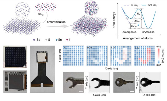 针对上述关键问题,研究团队通过异价掺杂方法,成功制备出具有高的相稳定性、强电荷收集能力和器件可拓展性的非晶硫化锑材料。理论和实验研究发现,异价金属卤化物的加入可改善硫化锑链状结构并降低体系自由能,进而增强了其玻璃化能力。非晶硫化锑具有窄带隙(1.66 eV)和高载流子寿命乘积(5.6×10-5 cm2V-1)的优势,由其组装的X射线探测器在20 V mm-1电场下实现了4397 μC Gy-1cm-2的探测灵敏度以及66 nGy s-1的最低检测限。另外,基于非晶硫化锑薄膜的面积均匀性和高灵敏度特性,成功实现了在低剂量率(2.12 μGy s-1)下实时高分辨的X射线成像。