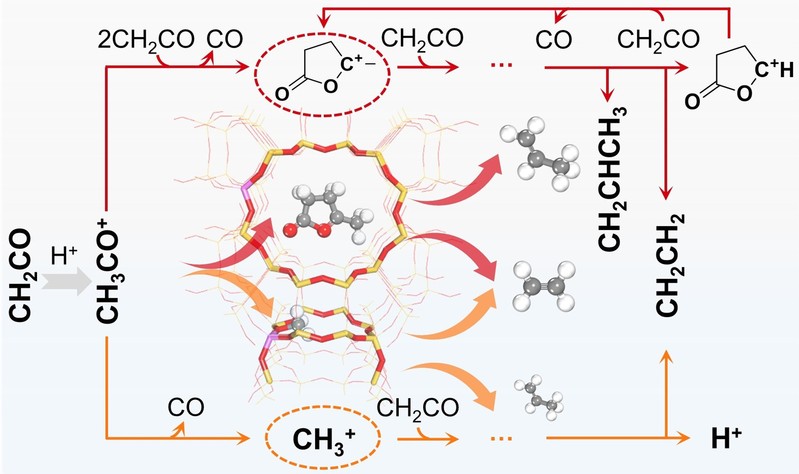 双功能金属氧化物-分子筛(OX-ZEO)催化剂因其具有将合成气转化为低碳烯烃的优异选择性而受到广泛关注。其中,分子筛组分的存在能够打破传统费托合成中的Anderson-Schulz-Flory(ASF)分布,从而实现低碳烯烃的高选择性生成。研究表明氧化物上可以生成乙烯酮(CH2CO),它作为关键的反应中间体扩散到分子筛中,进一步转化为低碳烯烃。然而,由于分子筛孔道结构复杂且活性位点多样,CH2CO在原子层面上如何转化为低碳烯烃的微观机制仍然模糊且存在争议,阻碍了OX-ZEO催化剂的优化。