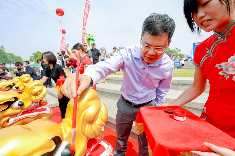 国家留学基金委来华留学管理部副主任王静宣布龙舟赛开幕。随后,沈海涛、王静、市教委国际交流处周勤健等共同为龙头点睛。