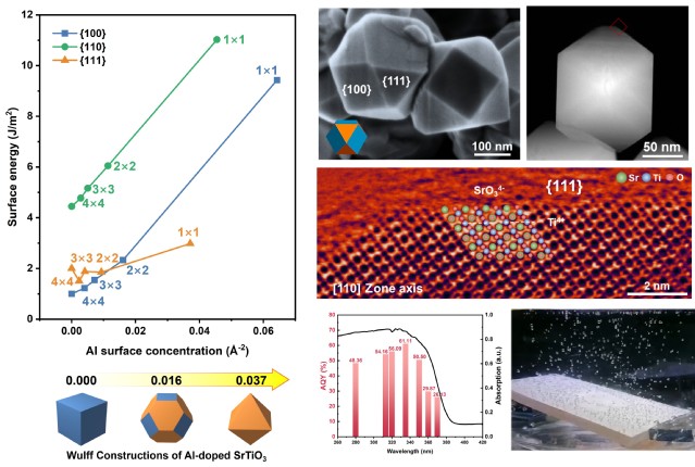 太阳能驱动的分解纯水制氢,被视为最具潜力的绿氢制取技术之一。光解水反应由光吸收、电荷分离和表面反应三个连续的过程组成,其中光生载流子的分离与传输作为连接光激发与表面催化反应的关键环节,面临着错综复杂的电荷迁移、传输、复合等多重路径,导致大量光生载流子在材料内部“迷路”复合,成为限制光解水反应效率的核心瓶颈。研究人员发现,具有各向异性晶面的单晶半导体如同构建了“电荷立交桥”,不同取向的晶面具备独特的电荷特性,可驱动电子与空穴分别驶向专属晶面,这种空间分离特性不仅能大幅降低电荷复合概率,更实现了氧化还原反应的分区进行,为突破效率瓶颈提供了一种有效的解决方案。然而,传统高温固相合成难以精确控制单晶材料的晶面结构,导致电荷传输通道受阻。在近期的研究结果中,研究团队通过熔盐辅助固相合成方法,揭示了微量Al3+掺杂对钛酸锶(SrTiO3)单晶{111}晶面结构的调控作用(J. Am. Chem. Soc. 2024, 146, 6618),进而构建出高效的各向异性晶面结构。尽管如此,对于Al3+调控SrTiO3单晶表面结构的深层机制仍然缺乏系统的理解。