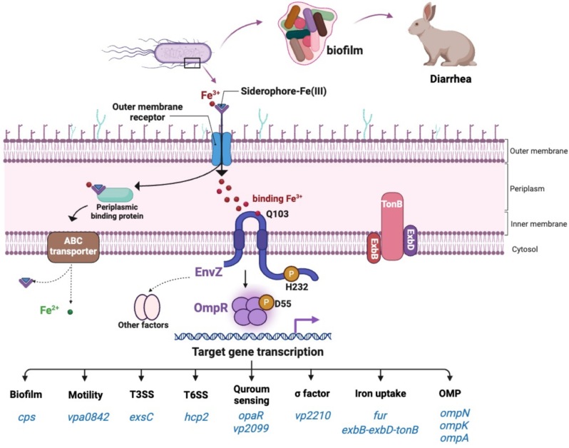 研究团队首次发现该菌的双组分系统EnvZ/OmpR除了感知渗透压外,还具有感知三价铁离子(Fe3+)的特殊能力。通过系统的分子生物学实验,研究人员证实EnvZ蛋白的周质结构域能够特异性识别并结合Fe3+,这一过程依赖于关键氨基酸位点—103位谷氨酰胺(Q103)。EnvZ铁离子结合触发其自磷酸化,进而激活下游OmpR相关调控网络,最终协调细菌的生物被膜形成、运动能力和毒力表达等过程。团队成员进一步采用多组学联用策略,通过RNA-seq与ChIP-seq分析,绘制了EnvZ/OmpR调控网络的完整图谱。研究发现,外膜蛋白编码基因ompN的表达受铁信号严格调控,在envZ缺失菌株中表达量骤降21倍。进一步实验证实,ompN是调控生物被膜形成的关键效应分子。