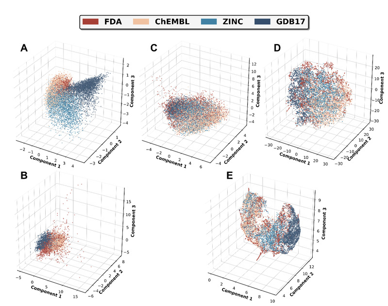 图1:CLVAE(A)、VAE(B)、PCA(C)、T-SNE(D)、UMAP(E)方法类药空间构建对比图