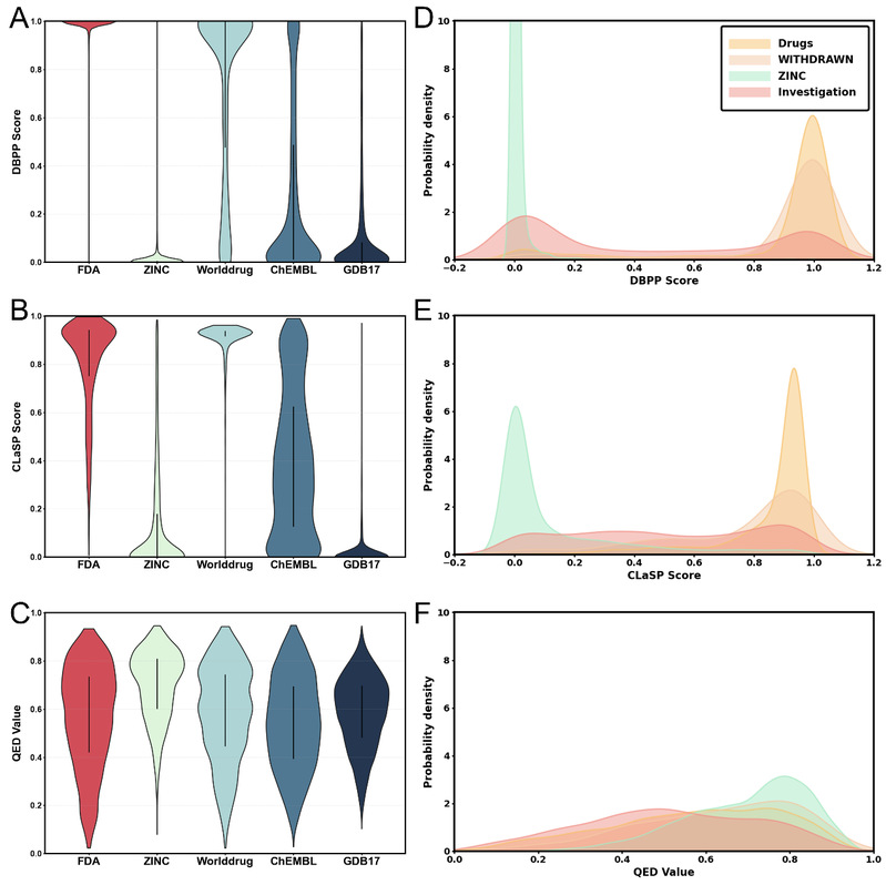 作者在多类数据集上系统评估了CLaSP:以FDA批准药物与其他国家/地区批准药物(Worlddrug)为正例集;以ChEMBL、ZINC(可购买化合物数据库)和GDB17(虚拟化学空间)为对照库;并引入WITHDRAWN(已撤市药物)与Investigation(在研药物)等真实集合进行外部检验。结果显示,CLaSP能输出可与药物优化流程直接对接的综合评分,在不同数据来源与化学空间上均表现出良好的判别力与适用性,具有较强的应用潜力(图2)。