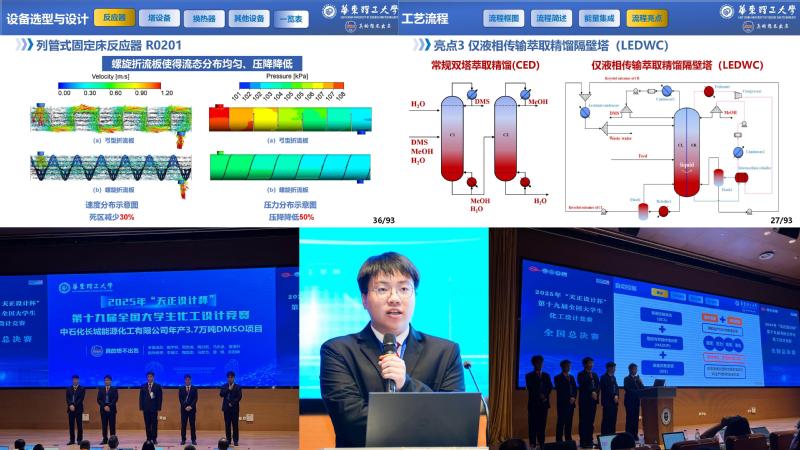2025年的竞赛的内容是“为某大型化工企业设计一座二甲基亚砜清洁生产的分厂,要求技术符合我国绿色低碳循环发展要求”。我校团队以某厂生产废气中的硫化氢为原料,采用二氧化氮氧化法设计了年产3.7万吨二甲基亚砜项目。历经7个月,团队成员从项目可行性研究、工艺方案比选论证、流程搭建、设备设计及选型、自动控制、总图布置、车间布置、安全评价、经济分析等多个方面,对项目进行精心设计,大胆应用四大创新:反应器结构创新、过程强化技术创新、分离技术创新、过程设备创新,符合中国制造2025的要求。团队的5位指导教师为李瑞江、陶国忠、马宏方、雷明、彭阳峰,另有沈荣春、魏永明、杨座国、杨敬一、黄子宾及袁佩青等6位教师深度参与了竞赛指导。化工学院党委书记段学志、副院长周兴贵、吴艳阳等非常关心队伍的备赛情况,并从工艺路线、反应器设计、现场答辩方法等方面提出了宝贵建议。