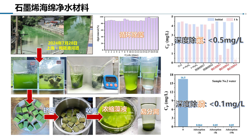 在众多研究项目的推进过程中,令邢明阳印象最深刻的是“石墨烯海绵净水材料”项目。自2017年起,邢明阳先后带领2名硕士生和2名博士生接力攻关,从材料设计、功能调控到实际应用验证,历时8年最终开发出一种可同步除氟、除磷、除藻的多功能海绵。该海绵具备成本更低、环境友好、可循环使用等优势,且可根据用户需求实现定制化设计,展现出较强的环境适应性与功能集成能力。目前,该材料核心技术已完成知识产权布局,在实际系统中通过多轮测试,成功应用于企业废水处理工程,商业化潜力巨大,未来可广泛应用于藻类回收培养、饮用水净化等领域,市场前景广阔。